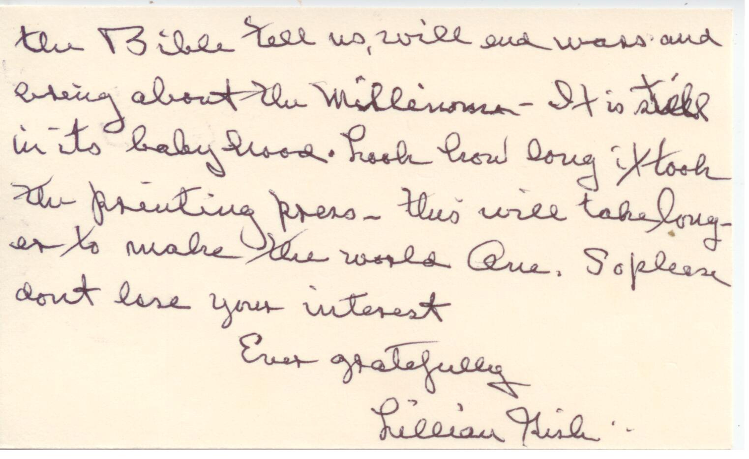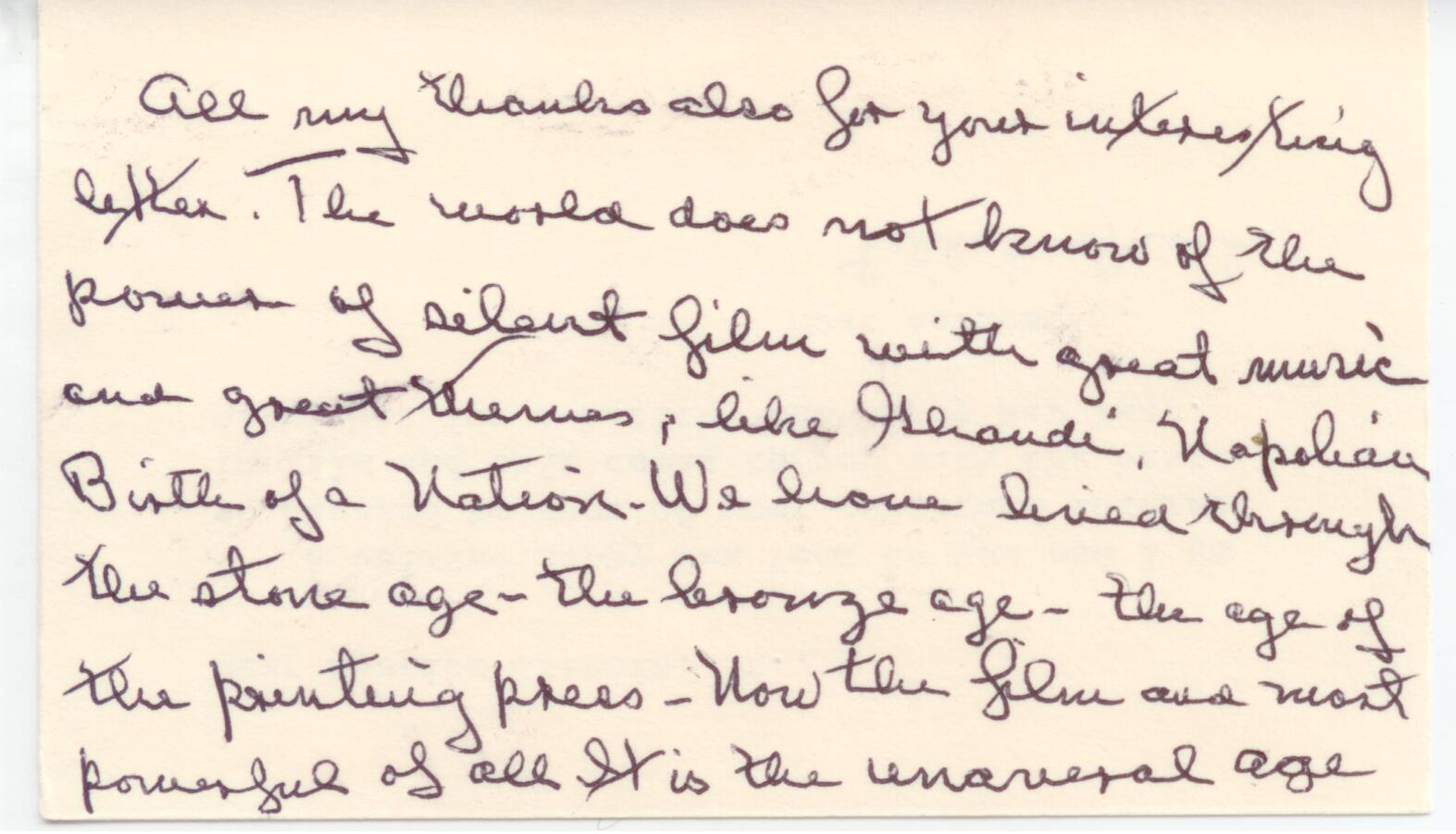All my thanks also for your interesting letter. The world does not know of the power of the silent film with great music and great themes, like Ghandi (Gandi), Napoleon, Birth of a Nation. We have lived through the stone age-the bronze age-the age of the printing press-Now the film and most powerful of all It is the universal age the Bible tells us will end wars and bring about the Millennium-It is still in its babyhood. Look how long it took the printing press-this will take longer to make the world One. So please don’t lose your interest.