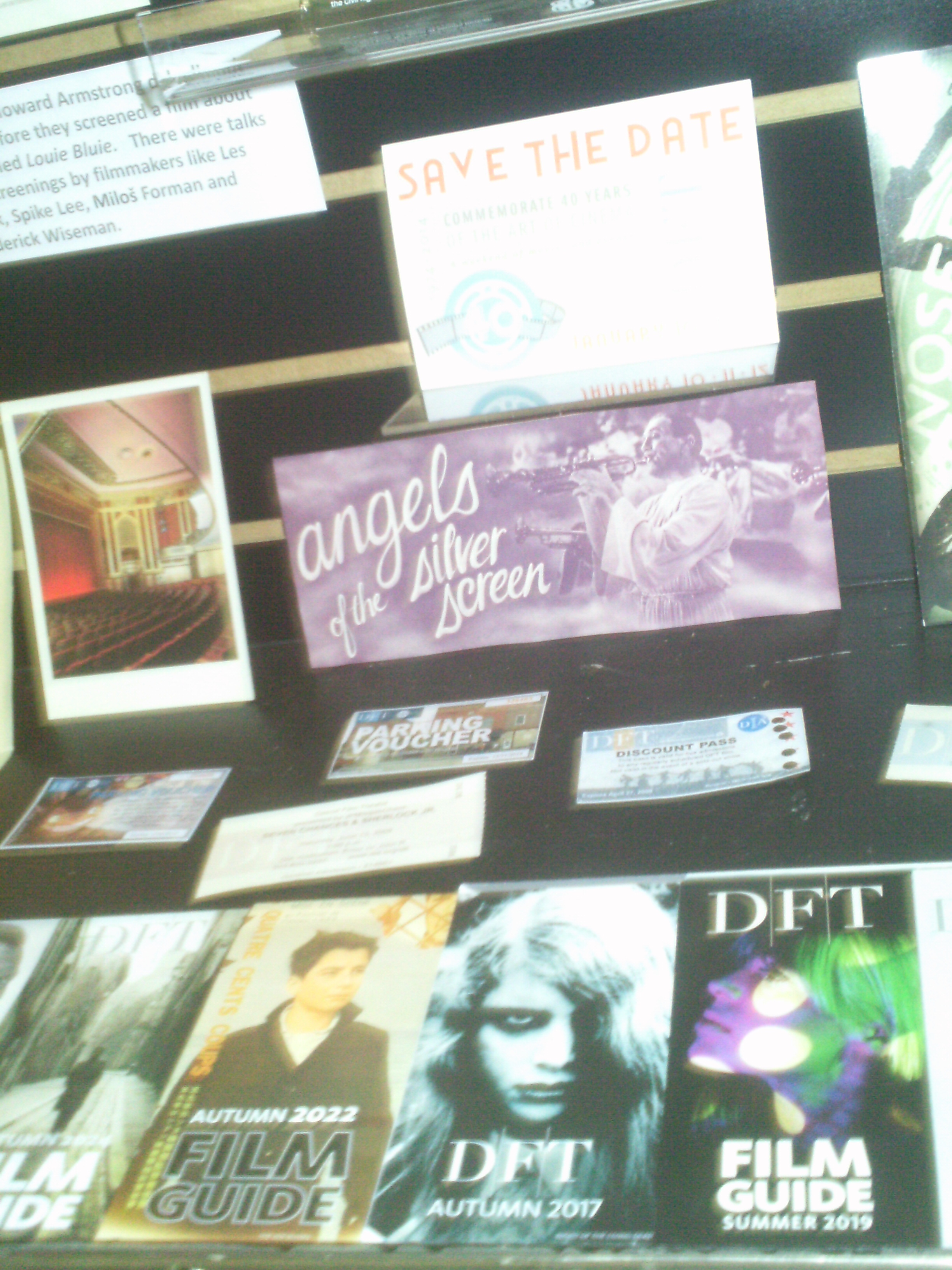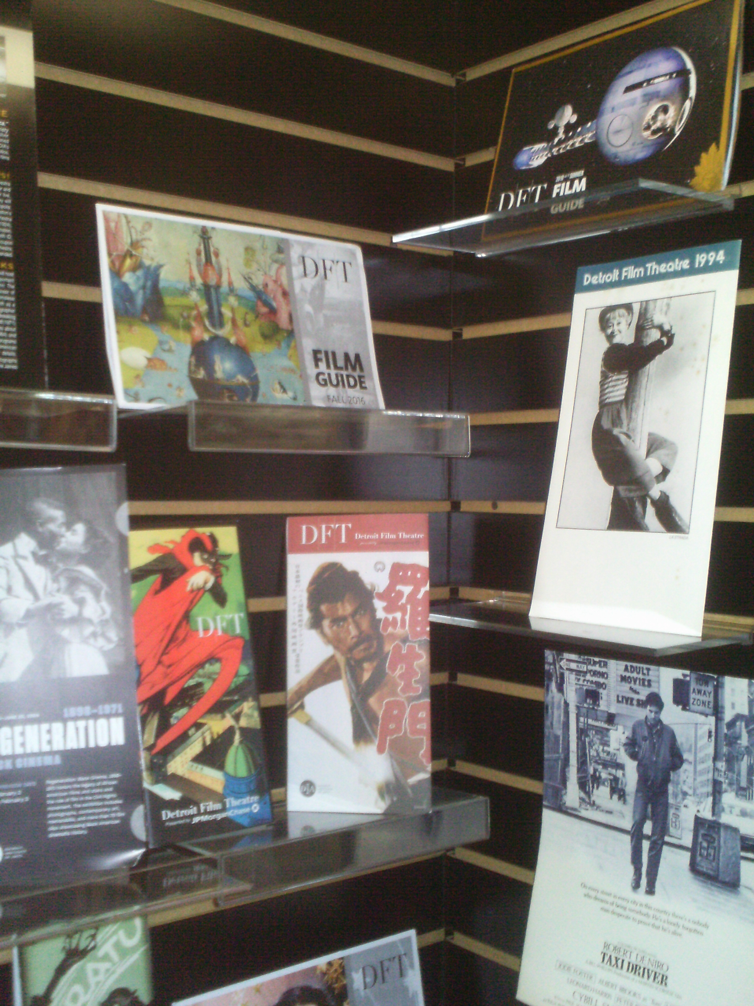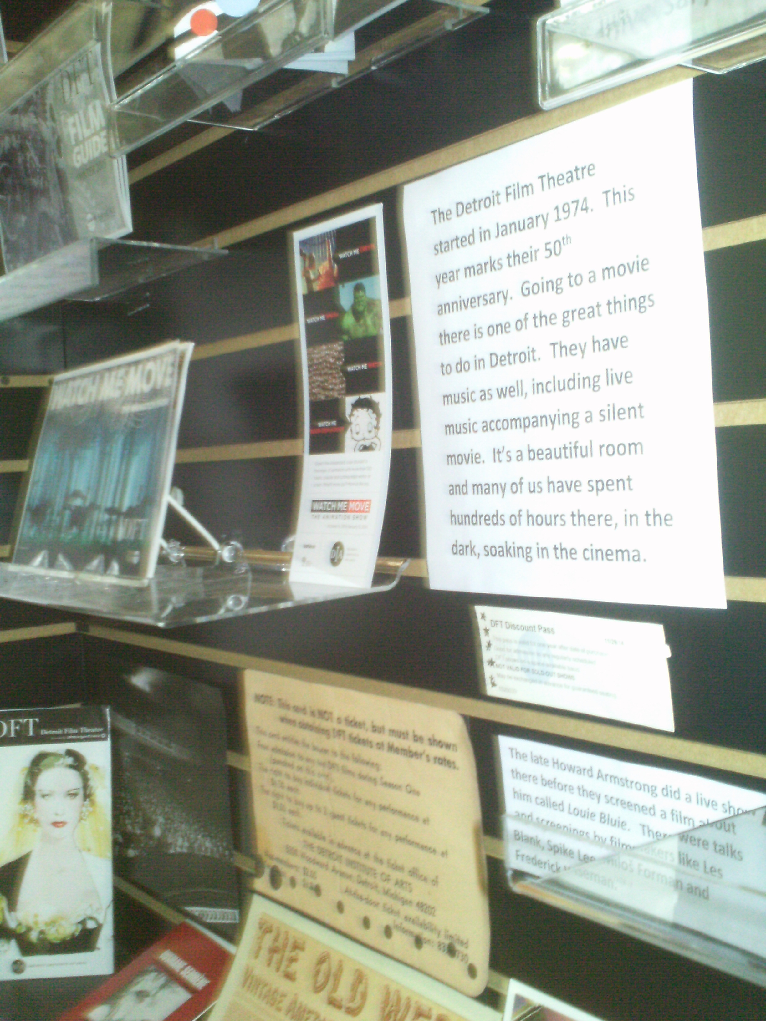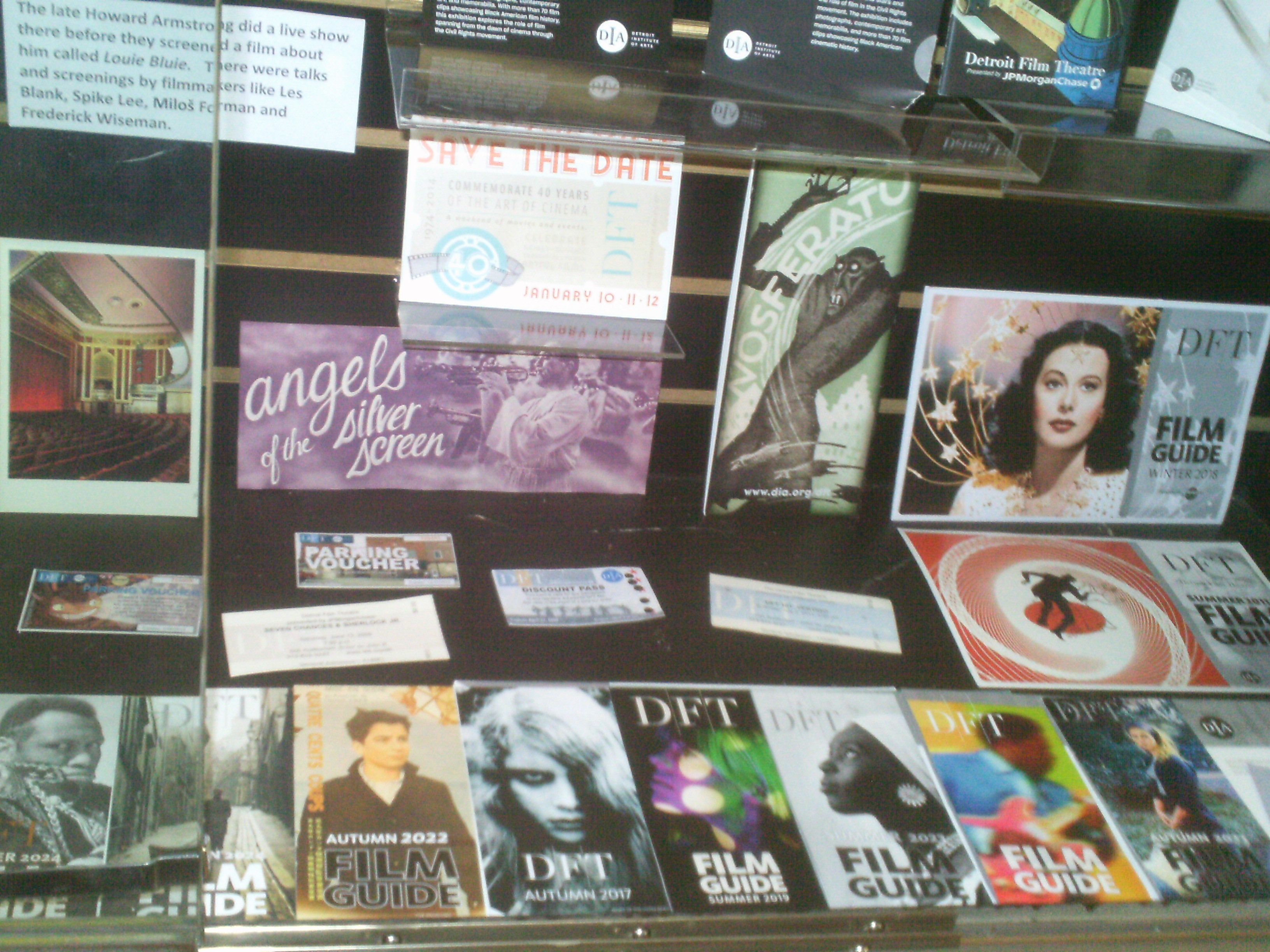 In Summer of 2024, I installed a large exhibit exploring Detroit and the Movies here at the library of the University of Detroit Mercy. In September, I took most of it down but I left one case up, by the exit door. This was entirely a tribute to the Detroit Film Theatre, which celebrated its 50th anniversary last year.